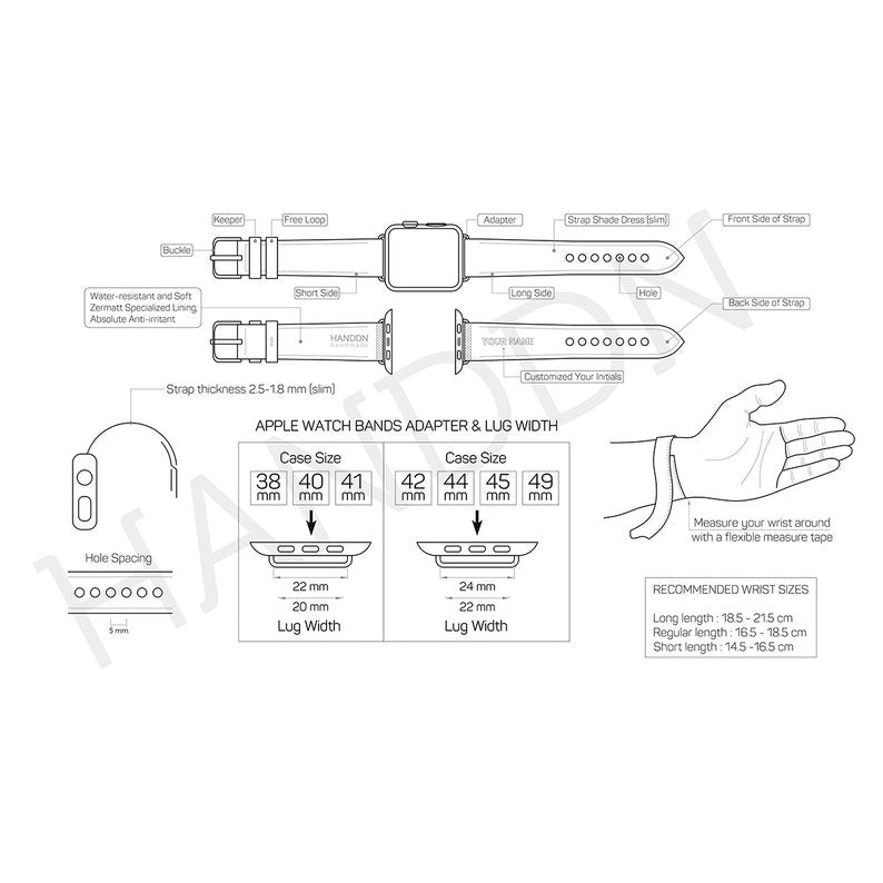 - Structure of a set of HANDDN Apple watch bands: Pueblo Leather main face, durable and soft Zermatt specialized lining, absolute anti-irritant, Velodon specialized reinforced material (SH-220 reinforcement).