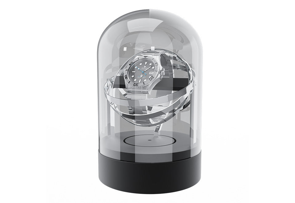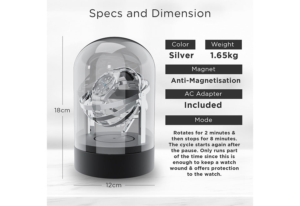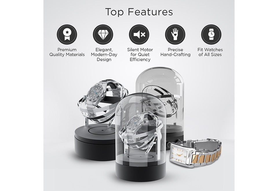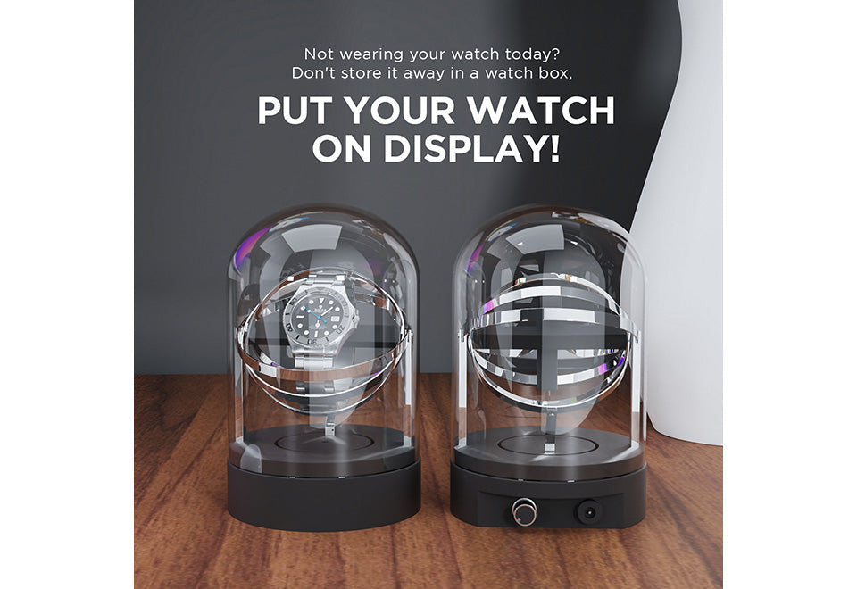 Wind and display your favorite watch with the Luxury Glass Automatic Watch Winder. Exquisitely crafted with aluminum, stainless steel and high-density, crystal-clear glass, it gives your favorite luxury watch a place of distinction while keeping it wound and ready to wear. Features an anti-magnetic autowind motor that rotates your watch clockwise, counterclockwise or both at a rate of 1,350 rotations per day, plus a flexible T-shaped holder that accommodates all watch brands and sizes.