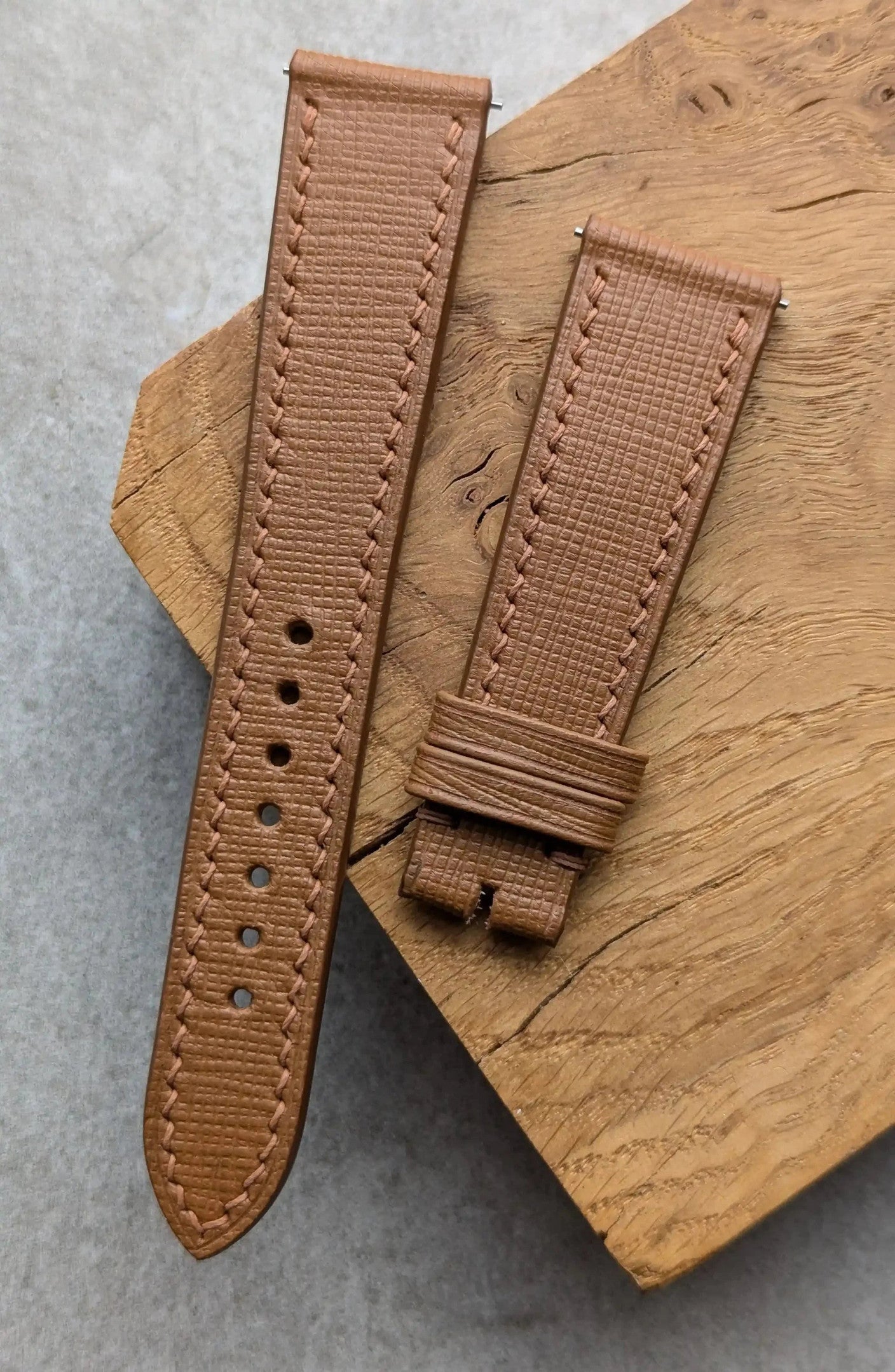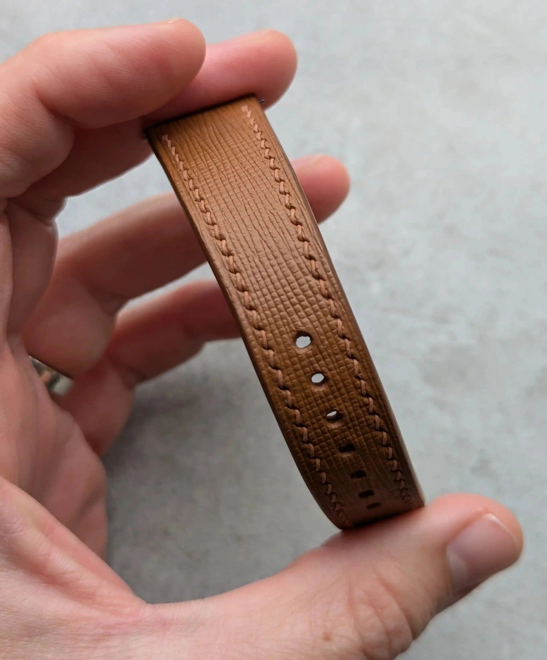 Saffiano has medium pliability and comfortable straight away, the moment you fit it to your watch. A pliable leather that wears beautifully on the wrist an exudes a casual elegance. The surface is scratch resistant and has a uniform grain with good water resistance