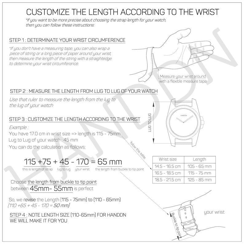 Take a ruler and measure the width between the two joints. Usually they will be about 18mm/20mm/22mm/24mm wide.(If you have a special request, please write a note to me in the order or email us for customization information topleather.company68@gmail.com)