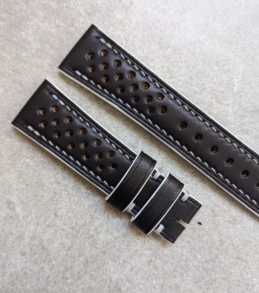 French Calfskin Rally Watch Strap - Black W/Sandstone Stitching