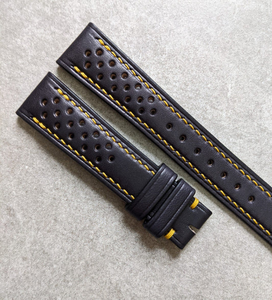 French Calfskin Rally Watch Strap - Black W/Yellow Stitching