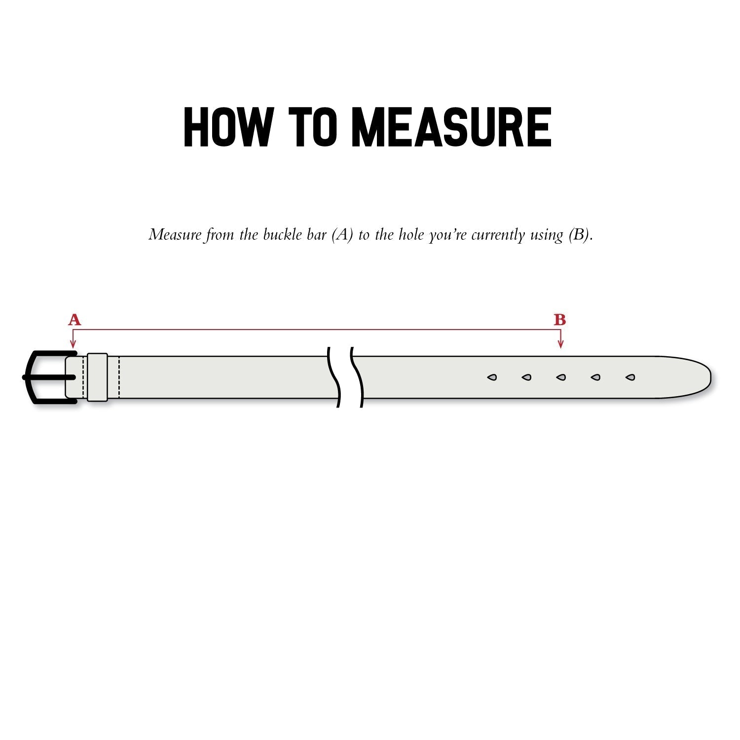 How To Measure: The best way to get your correct size is to measure your current belt. Take off your belt and measure from the buckle bar to the hole you wear. This is the size to order. Our belts are measured true to size, meaning the listed length is the true length in inches from the bucks bar to the middle adjustment hole. Therefore, you should typically purchase a belt one size (2") longer than your standard jeans waist size. (If you wear a 34W jean, buy the 36" L belt.) Don't see your size? Send me an email info@ashlandleather.com.