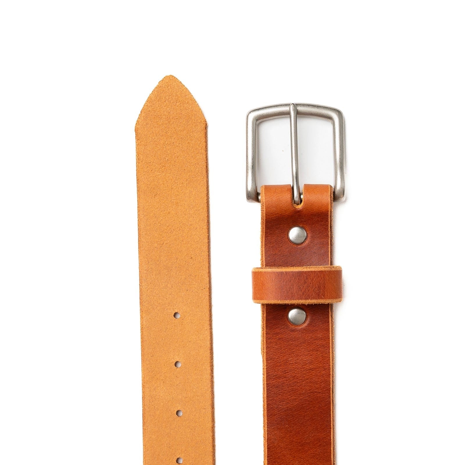 Our full-grain leather develops a rich patina and fits better over time. We take the time to burnish and polish every belt edge – this adds refinement and allows the strap to pass smoothly through your hands. Finally, a solid brass buckle offers a comforting weight and keeps your pants where you want them.