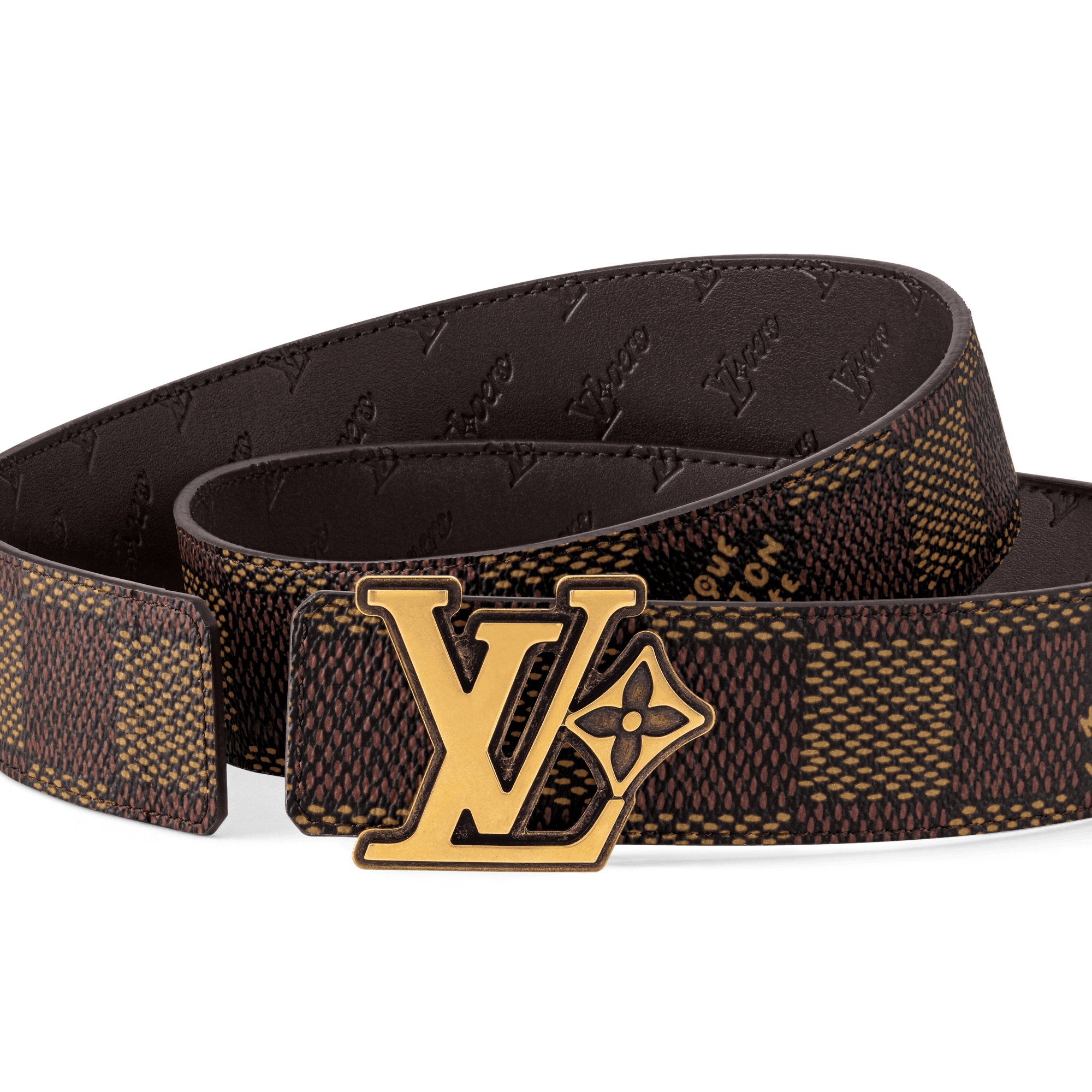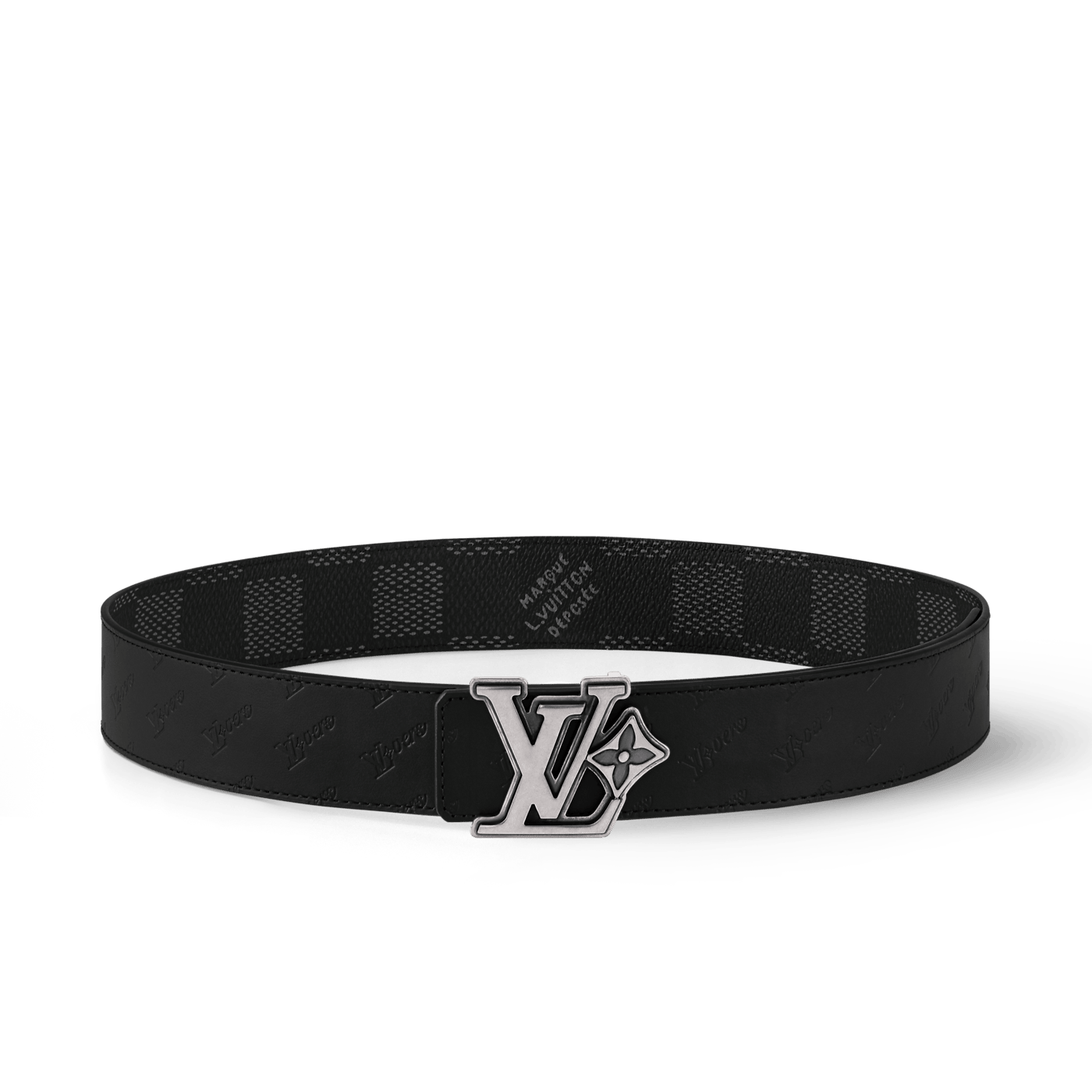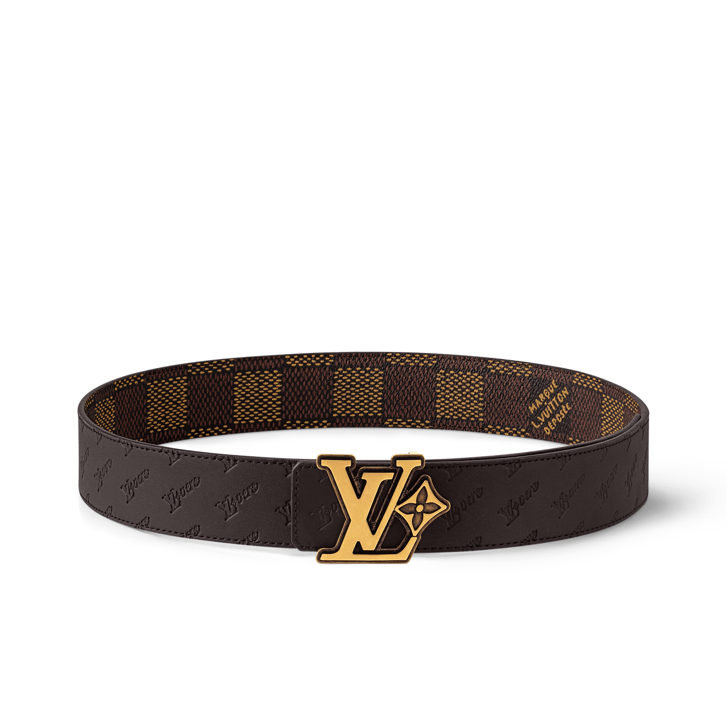 The LV Flower 40mm Reversible belt suffuses the House's time-honored elements with modernity. The canvas side is coated with the graphic Damier Héritage motif, interspersed with the "Marque Louis Vuitton Déposée" signature, and on the other, the LV Flower emblem is embossed on leather. Conspicuous in its size, the buckle is simply alluring, with chunky initials paired alongside a single flower.