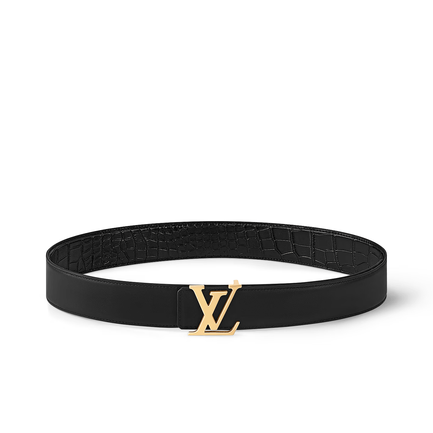 This luxurious edition of the LV Initials 40mm reversible belt features a handsomely crafted strap of rich, textured alligator skin, with a reverse side of smooth black leather. An exceptional accessory for a fashionable masculine wardrobe, this piece will elevate any silhouette. The signature buckle features an elegant golden finish, for a refined touch.