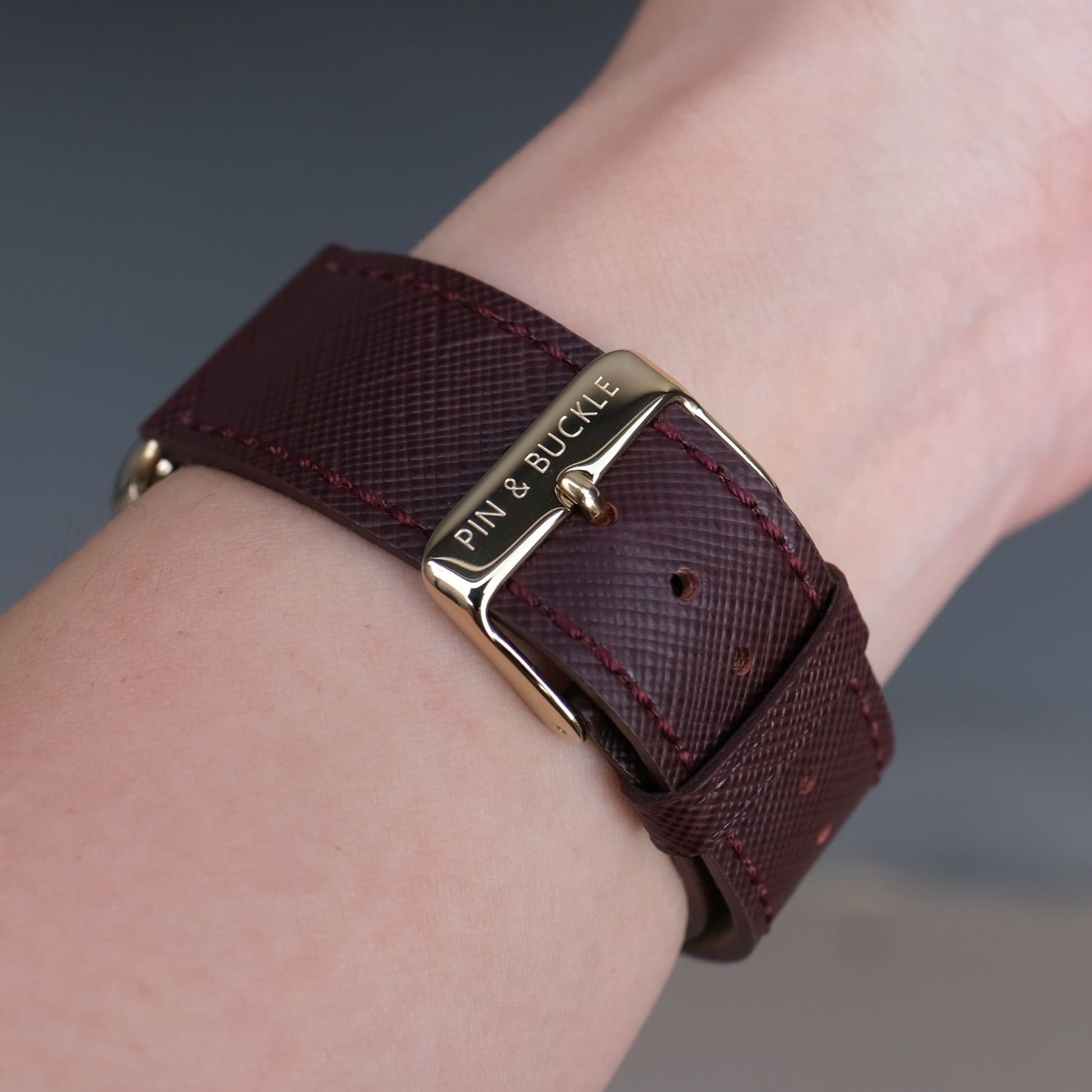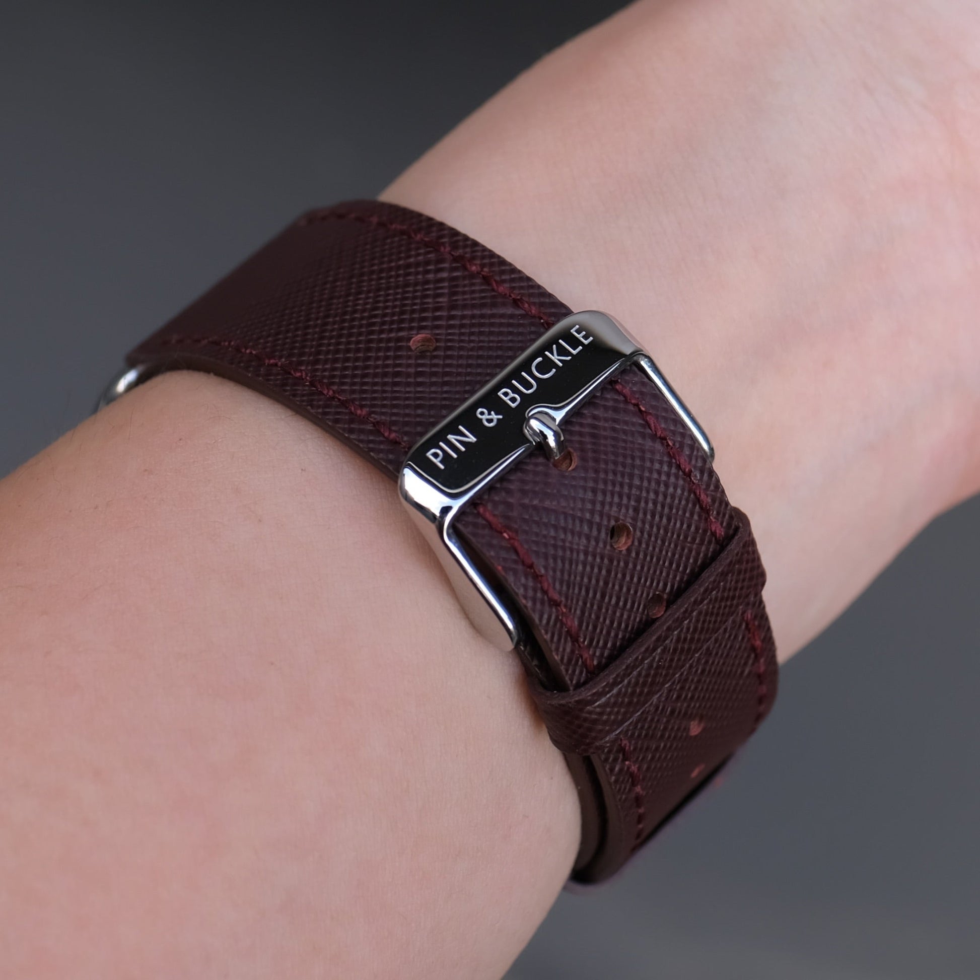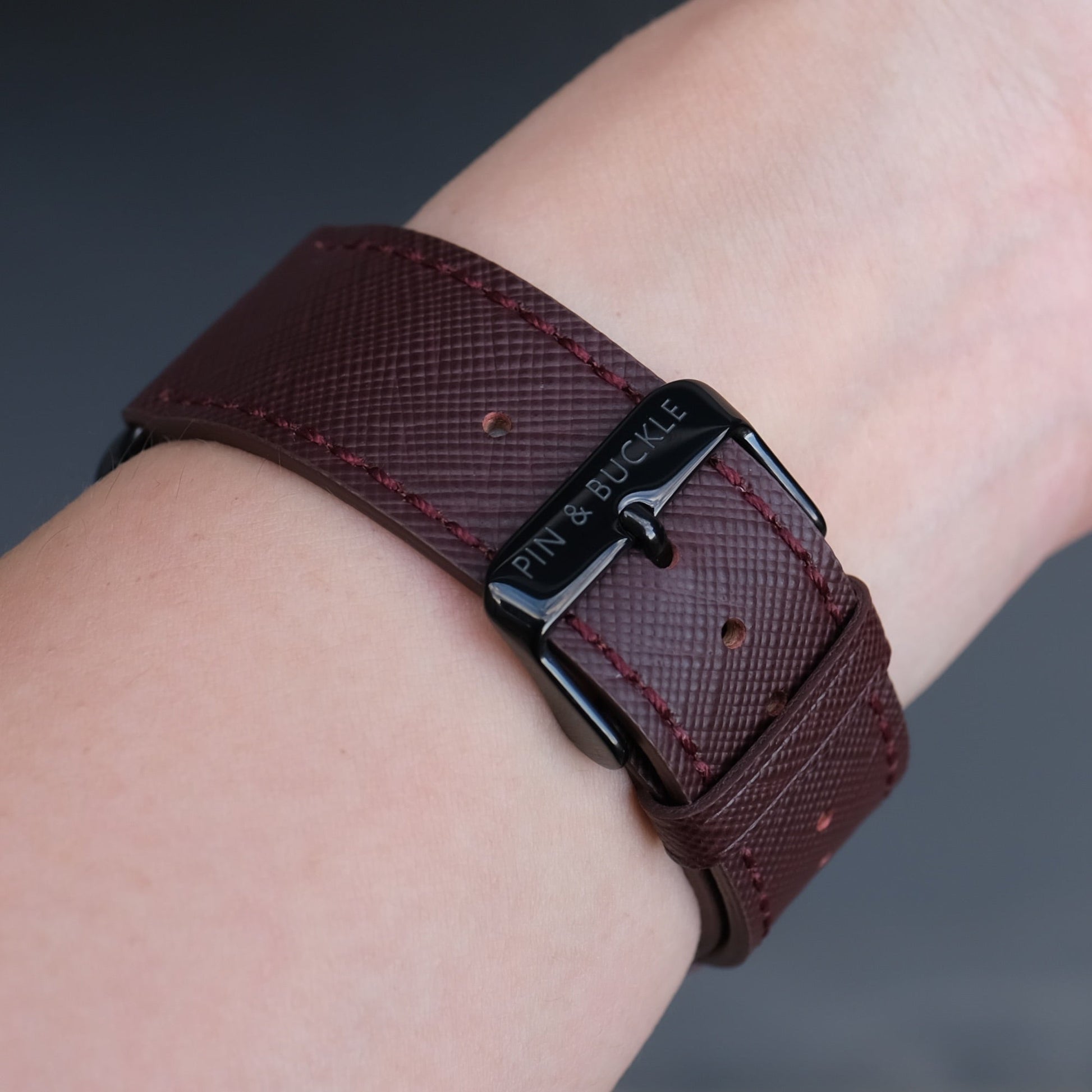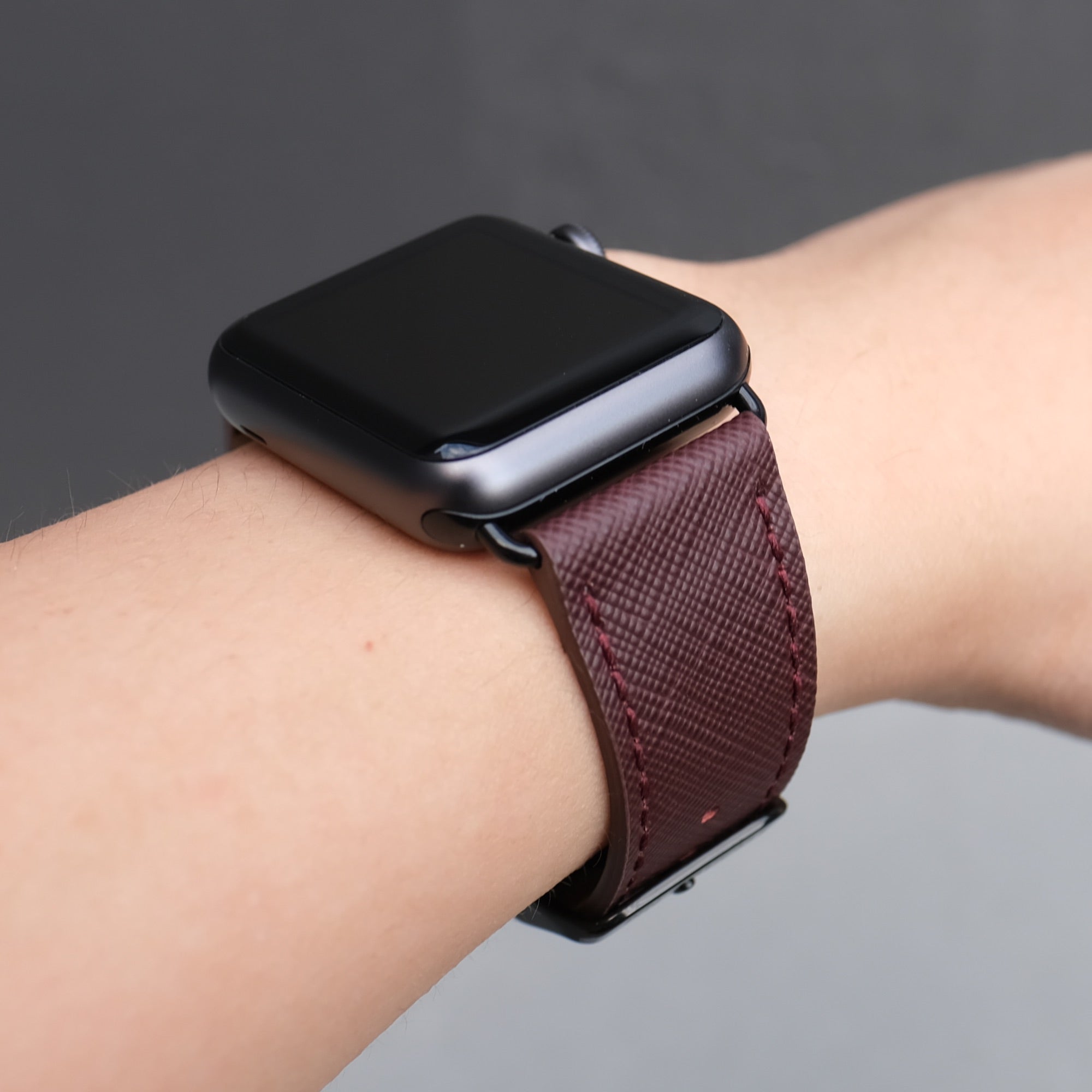 The Bordeaux Saffiano Apple Watch band features a deep shade of maroon that's not unlike a fine glass of wine. This Apple Watch band is perfect if you want a unique-looking Apple Watch band that's not too "loud".