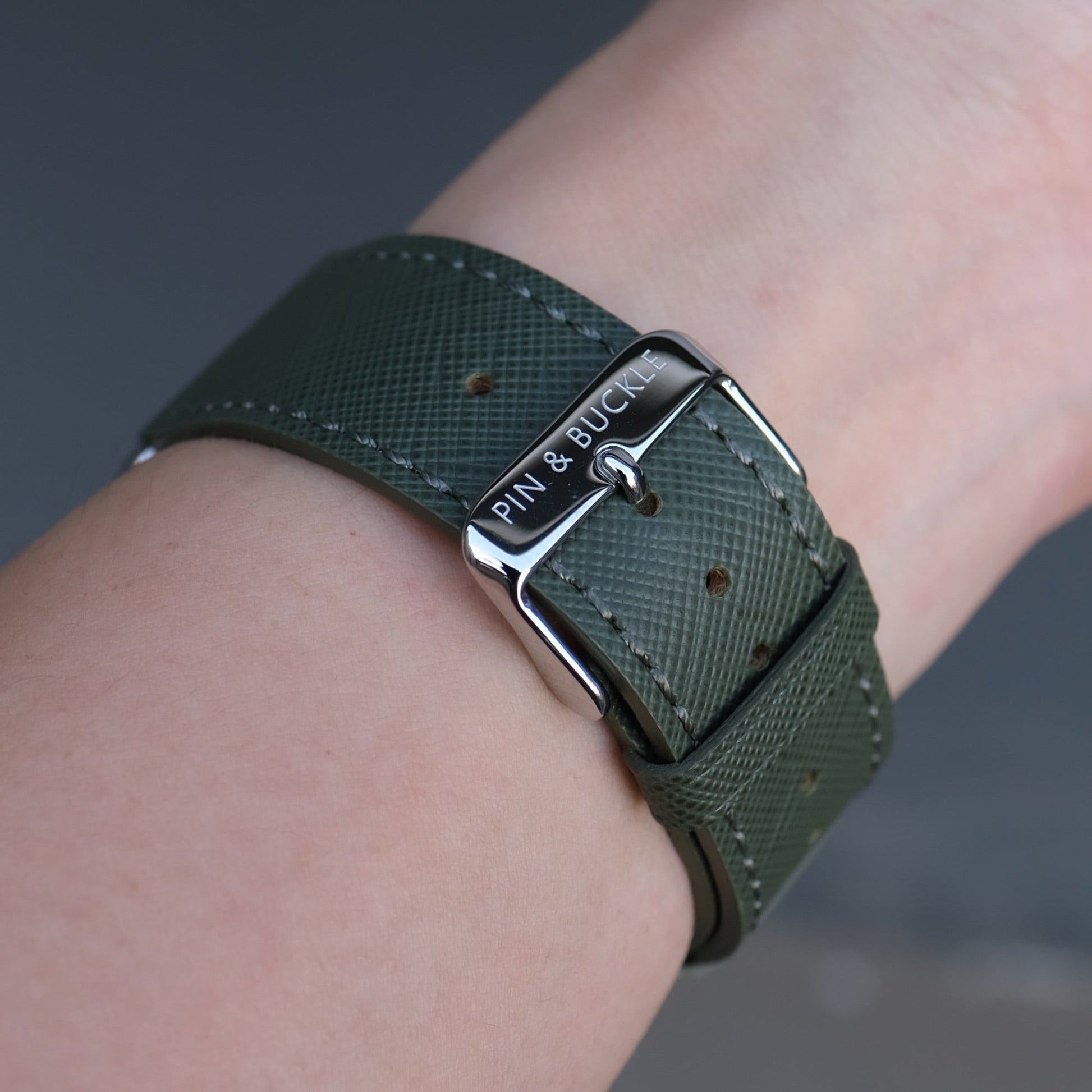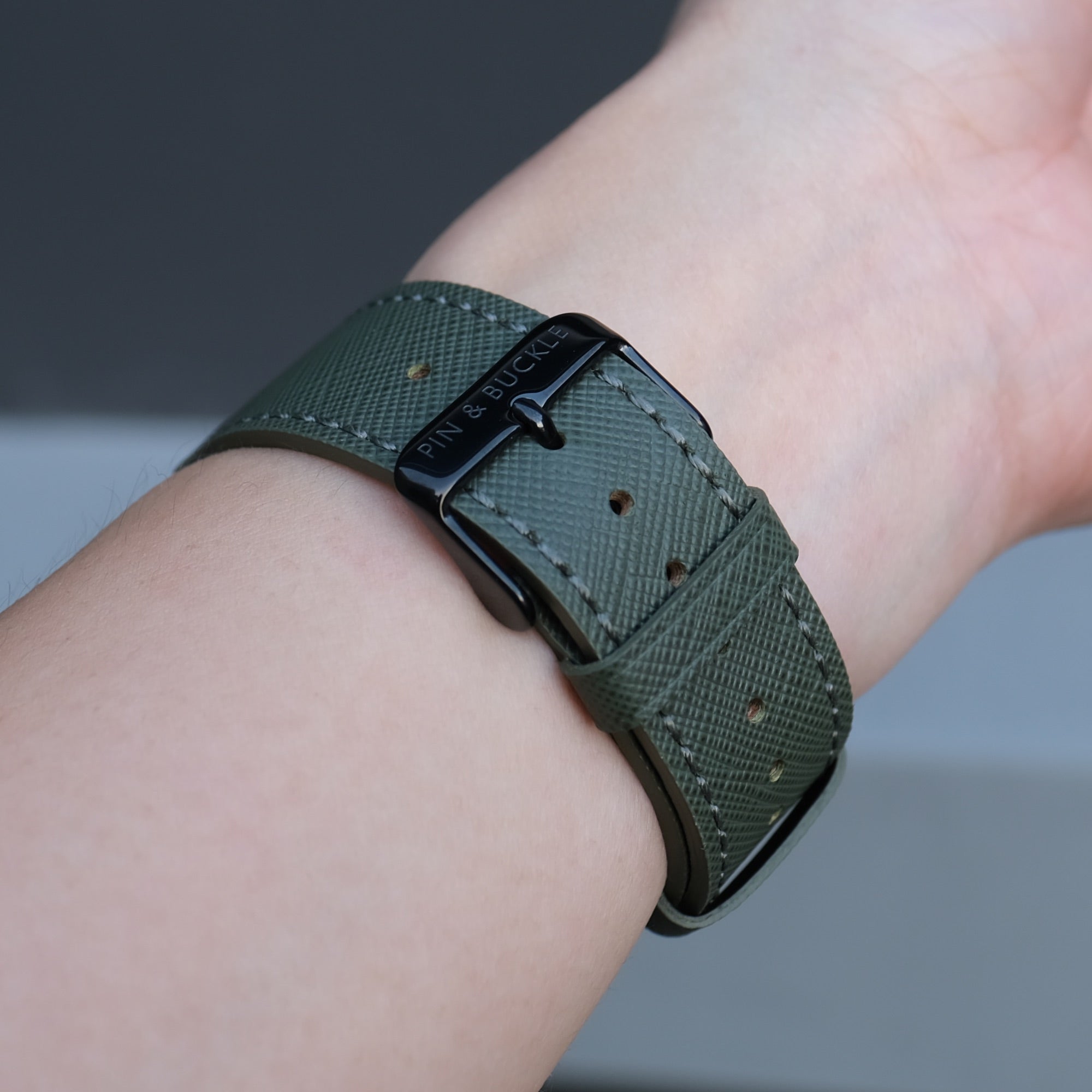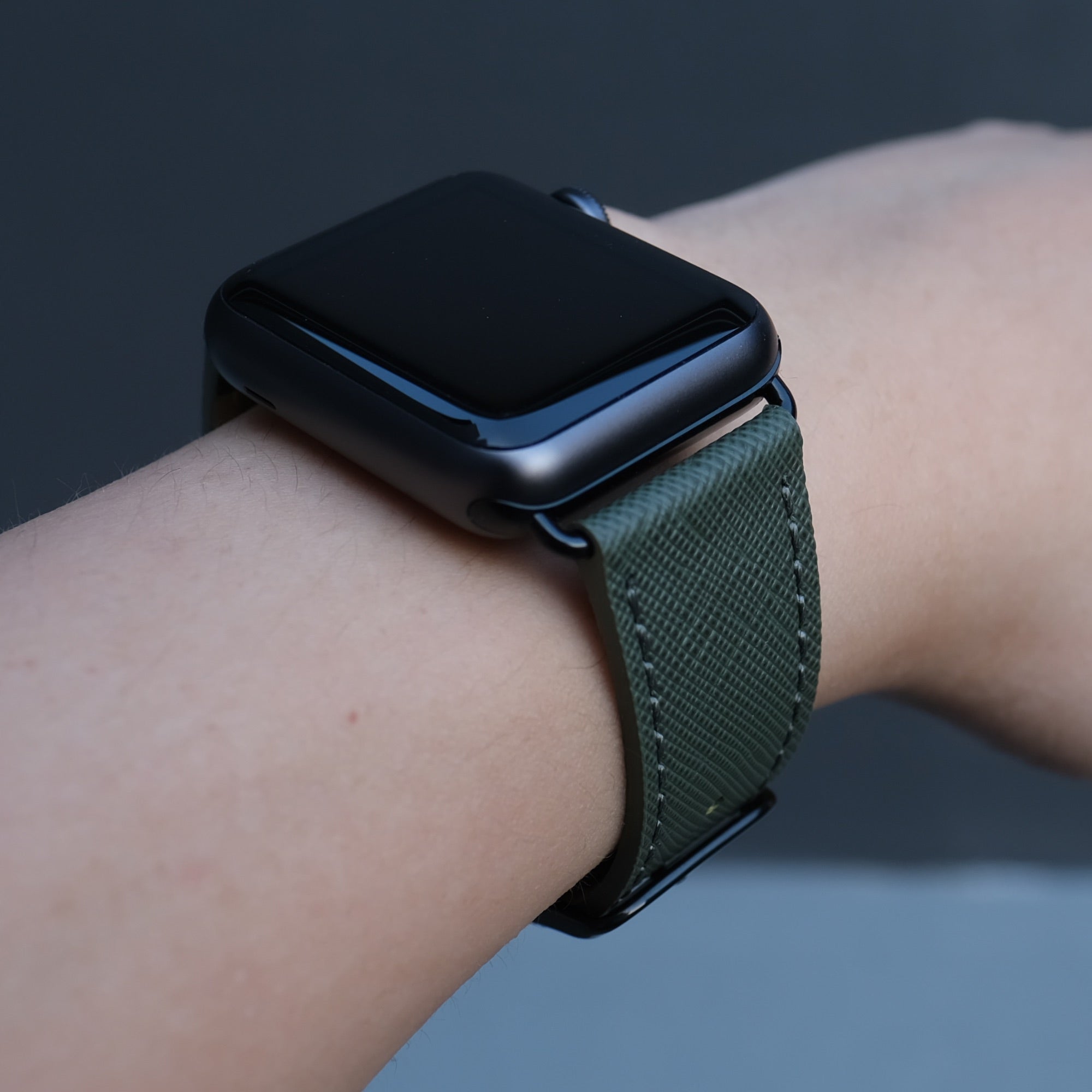 A subtle shade of green with grey undertones makes this Oak Green Saffiano Apple Watch band a unique addition to your Apple Watch band collection.